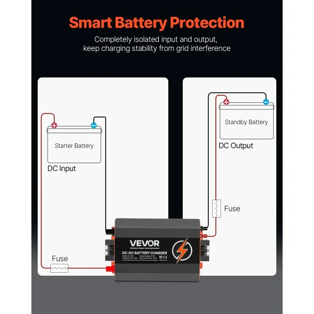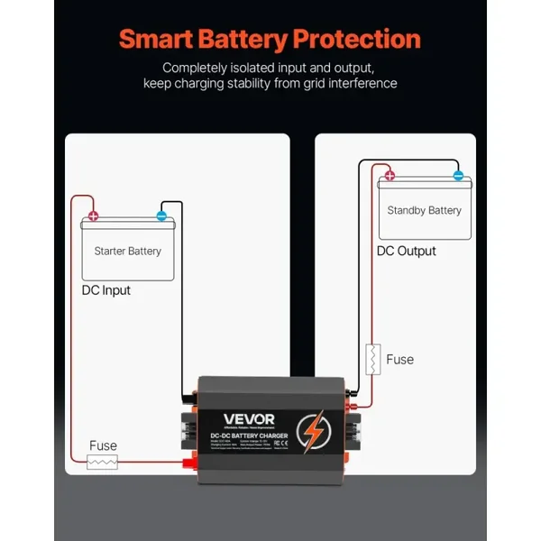 - Polyvalence des types de batteries : Ce chargeur CC/CC 12 V 60 A est compatible avec les batteries plomb-acide et lithium, et fonctionne avec différents types d'alternateurs. Il est idéal pour charger les batteries de secours des camping-cars, camions et bateaux