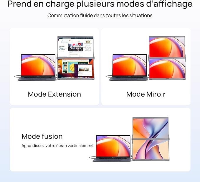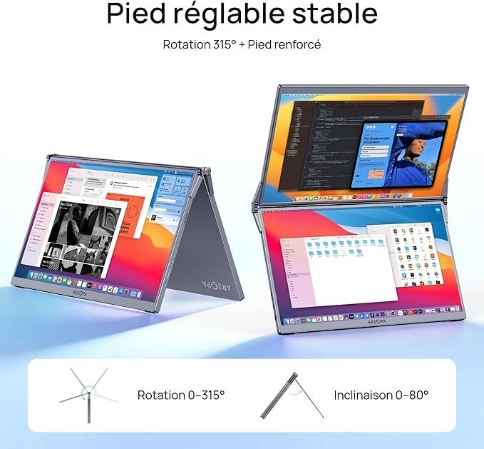 - Design pliant & empilable avec réglages flexibles: Structure intégrée d'écran double, élancée et portable pour les voyages et l'utilisation mobile. Réglage libre de l'écran à 320° + support stable répondent à toutes vos exigences sans installation supplémentaire, et prennent en charge trois modes d'affichage pratiques : Copie, Extension et Mode cascade.
