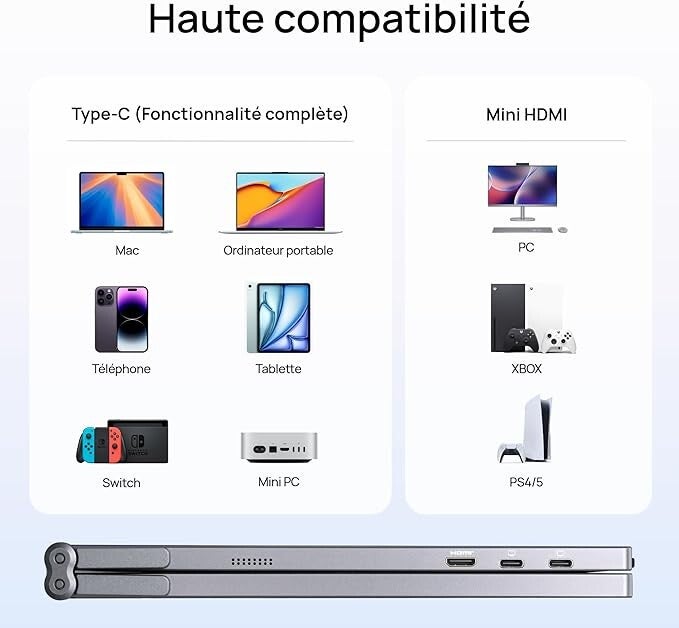 - Compatibilité étendue avec les appareils: Fonctionnement fluide avec les ordinateurs portables, Mac, PC et systèmes Windows, en plus d'être parfaitement adapté aux appareils de gaming populaires comme la PS5 et la Xbox. Cet écran double est un excellent extension pour le télétravail, le travail à distance, les voyages, le gaming ainsi que tous les scénarios d'utilisation outdoor et mobile.
