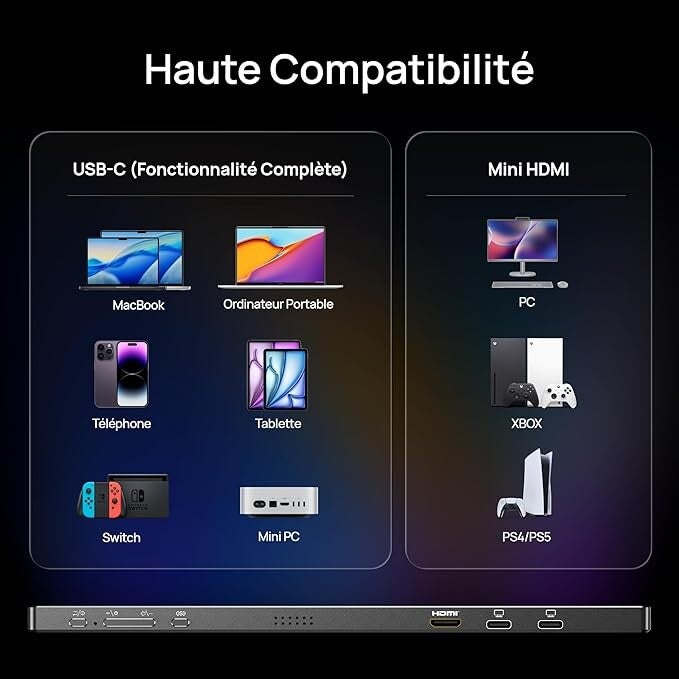 Interface d'entrée : Mini HD (signal vidéo), Type-C fonction complète (données vidéo, alimentation ISDN),