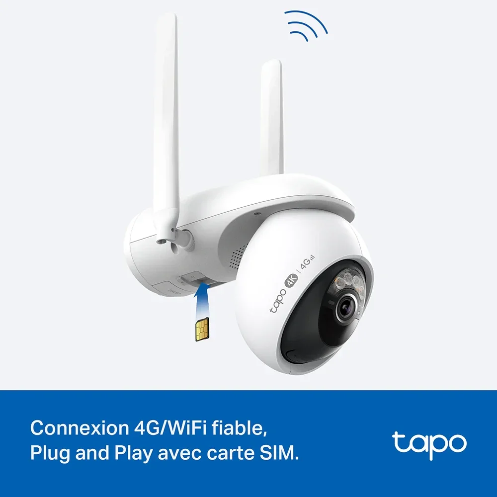 La Tapo C665G KIT est une caméra de surveillance extérieure 4K sans fil avec panneau solaire, offrant une sécurité optimale grâce à sa connectivité Wi-Fi et 4G LTE.