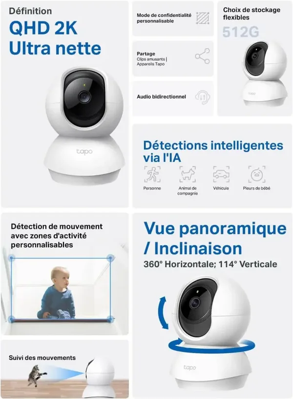 La Tapo C210 est une caméra de surveillance intérieure connectée offrant une vision panoramique à 360° et une résolution 2K 3MP pour une sécurité domestique intelligente. Elle propose des fonctionnalités avancées pour une surveillance efficace et personnalisable.