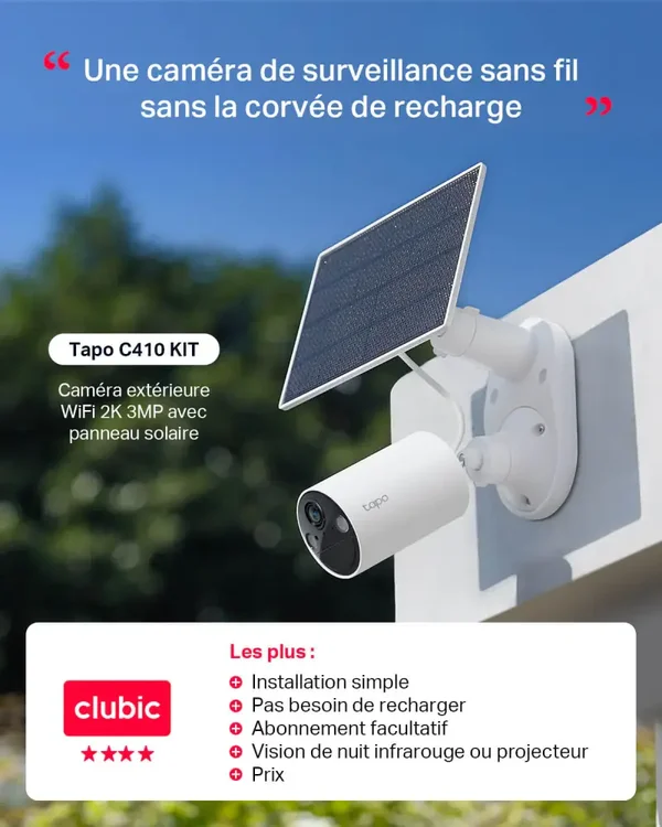 La caméra Tapo C410 KIT offre une surveillance extérieure haute résolution 2K 3MP sans fil, alimentée par énergie solaire pour une autonomie prolongée. Ce kit comprend une caméra résistante aux intempéries et un panneau solaire ajustable pour une installation facile et écologique.