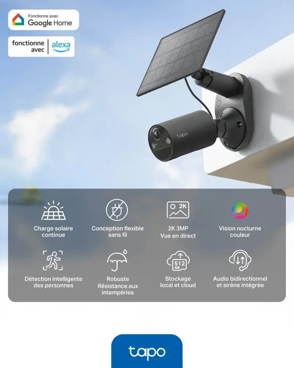 Le Tapo C411 KIT offre une surveillance extérieure haute résolution 2K sans fil, alimentée par énergie solaire pour une autonomie prolongée. Ce kit comprend une caméra résistante aux intempéries et un panneau solaire ajustable pour une installation facile et écologique.