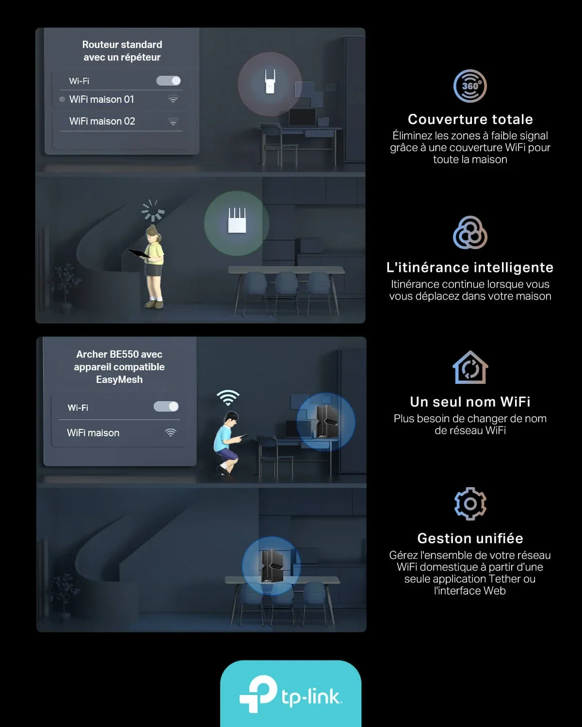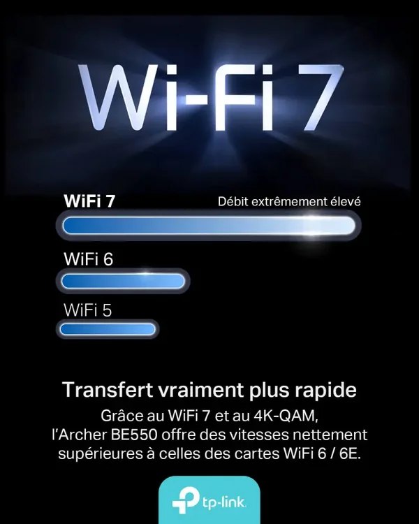 Le routeur TP-Link Archer BE550 offre une connectivité WiFi 7 tri-bande ultra-rapide avec un débit cumulé de 9214 Mbps, idéal pour le streaming 8K, le gaming et le télétravail. Profitez d'une expérience réseau optimale grâce à ses fonctionnalités avancées.
